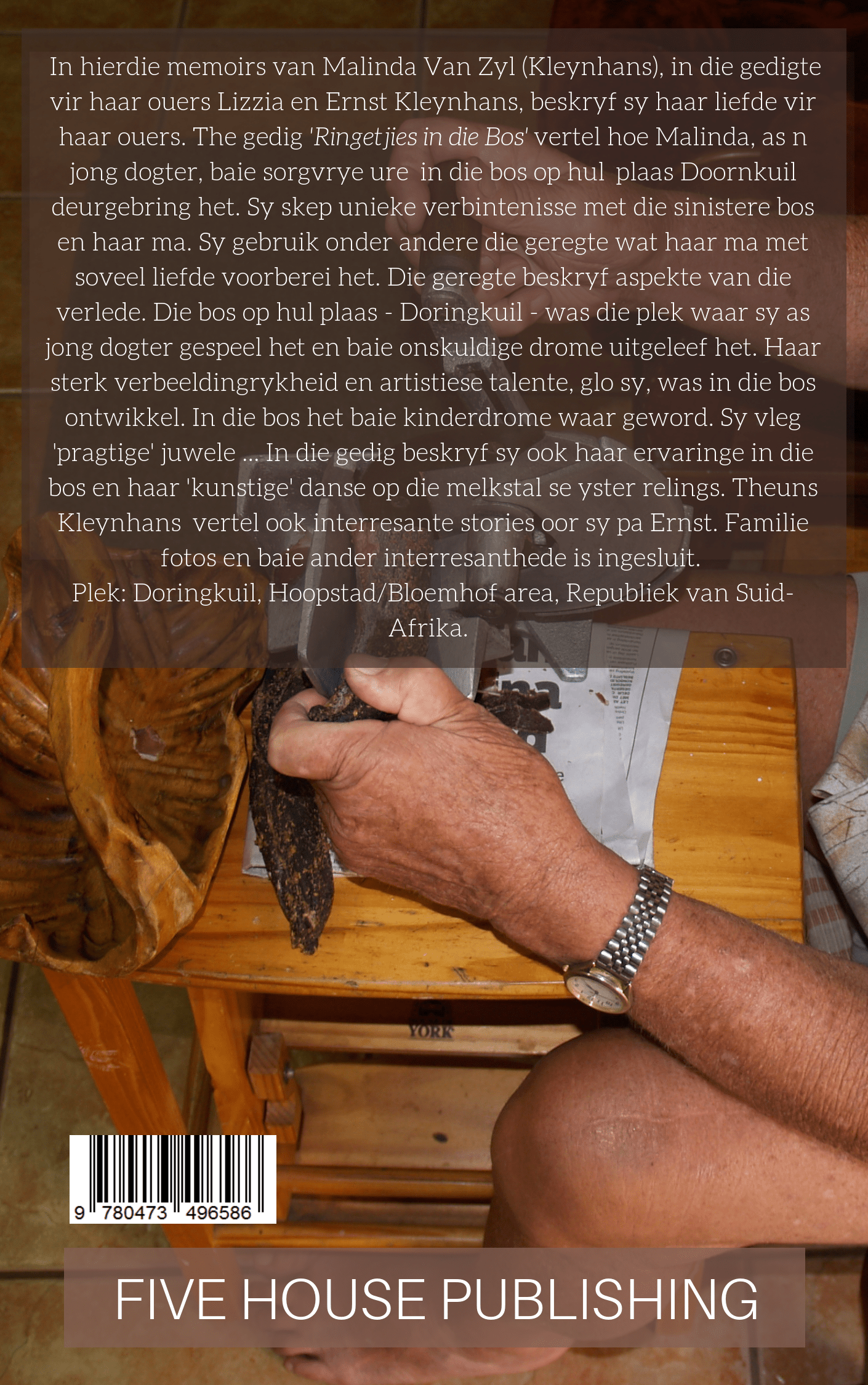 In hierdie memoirs van Malinda, en in die gedigte vir haar ouers, Lizzia en Ernst Kleynhans, beskryf sy haar liefde vir haar ouers. The gedig ‘Ringetjies in die Bos’ beskryf hoe Malinda – as n jong dogter – baie sorgvrye ure in die bos op hul plaas Doornkuil deurgebring het. Sy skep unieke verbintenisse met die sinistere bos en haar ma. Sy gebruik onder andere die geregte wat haar ma met soveel liefde voorberei het om haar ma en die gebeure van die verlede te beskryf. Die bos op hul plaas – Doringkuil – was die plek waar sy as jong dogter gespeel het en baie onskuldige drome uitgeleef het. Haar sterk verbeeldingrykheid en artistiese talente, glo sy, was in die bos ontwikkel. In die bos het baie kinderdrome waar geword. In die gedig beskryf sy haar ervaringe in die bos en haar ‘kunstige’ danse op die melkstal se metaal handrelings. Sy beskryf die kopseerplant… “Sy vleg ‘pragtige’ juwele … “