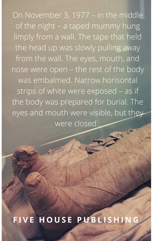 On November 3, 1977 – in the middle of the night – a taped mummy hung limply from a wall. The tape that held the head up was slowly pulling away from the wall. The eyes, mouth, and nose were open – the rest of the body was embalmed. Narrow horisontal strips of white were exposed – as if the body was prepared for burial. The eyes and mouth were visible, but they were closed…